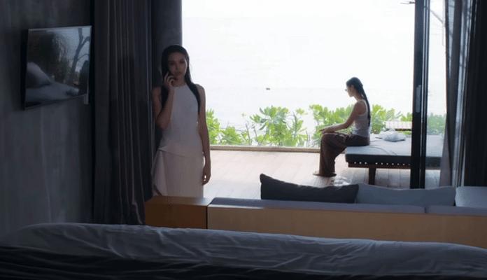 哪怕是被虚化作为背景,Lookmhee在露台躺椅坐着时的肢体语言,如掰自己的手指,摸自己的手臂,眼神不聚焦室内打着电话的Mae而是看向远处。这些小动作都不是无效动作,是在体现风波平息后Ai仍旧局促不安、自卑难堪、顾影自怜的心情。